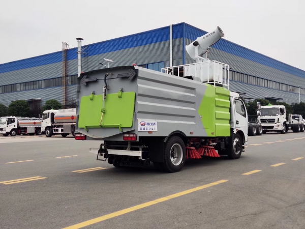 后噴霧:在洗掃車后部垃圾箱下方配有噴霧噴桿,噴霧噴桿上裝有多個噴霧噴嘴。啟動副發(fā)動機和高壓水泵,打開后噴霧開關,啟動底盤車前行,就可進行噴霧降塵作業(yè)。