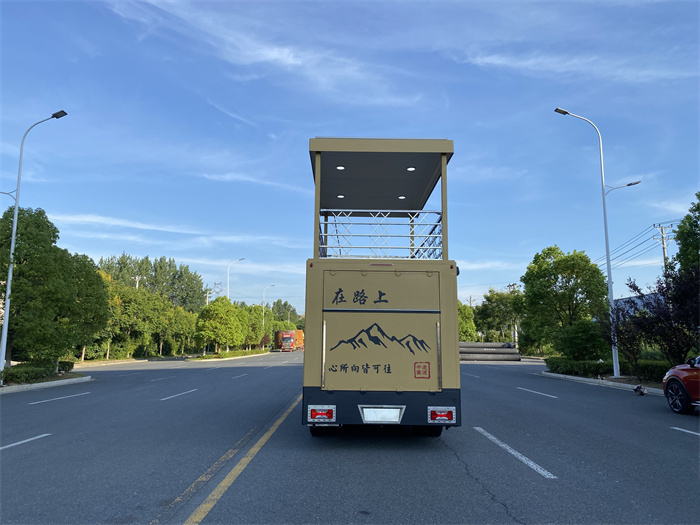 車身采用沙漠黃的顏色搭配黑色字母和駱駝圖案,讓人眼前一亮。車身右側(cè)配有4米遮陽棚,二級電動踏板,外置抽拉花灑,超大儲物艙。