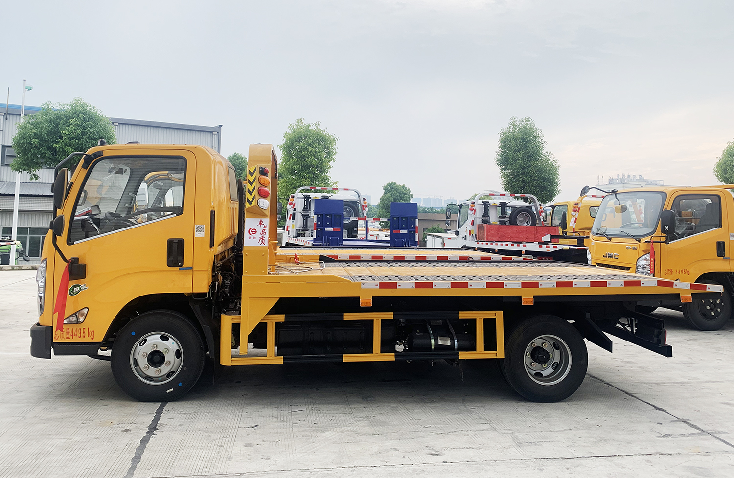 藍牌上裝配置:沖壓式平板一體板/伸縮板/翻轉(zhuǎn)板,液壓翻轉(zhuǎn)常規(guī)托舉裝置,平板可承載4噸以內(nèi)重物,主板長4~4.2米,折疊、伸縮或翻轉(zhuǎn)部分1~1.35米,平板總長可達5.1~5.35米,雙側(cè)聯(lián)動操作裝置,后工作燈三只,1個40KN液壓絞盤(25米鋼絲繩)一個工具箱一個洗手箱,配兩個**小車,四根新式綁帶,鏈鉤1條,L型抱胎架一對,托叉和托叉座各一對,帶2噸后托臂。